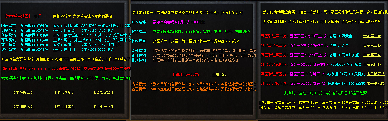 游戏介绍:新区开放第三天下午合区,晚上激情攻沙,沙奖丰富,请进游戏内体验!!